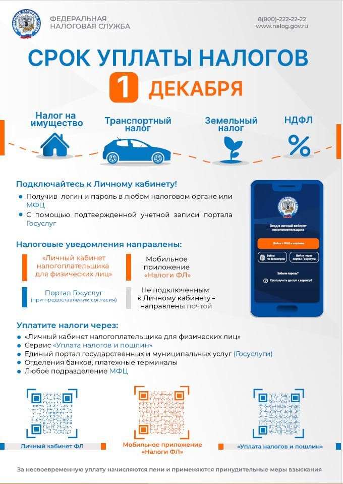 Оплатить исчисленные в уведомлениях налог на имущество, транспортный и земельный налоги необходимо не позднее 1 декабря 2025 года.