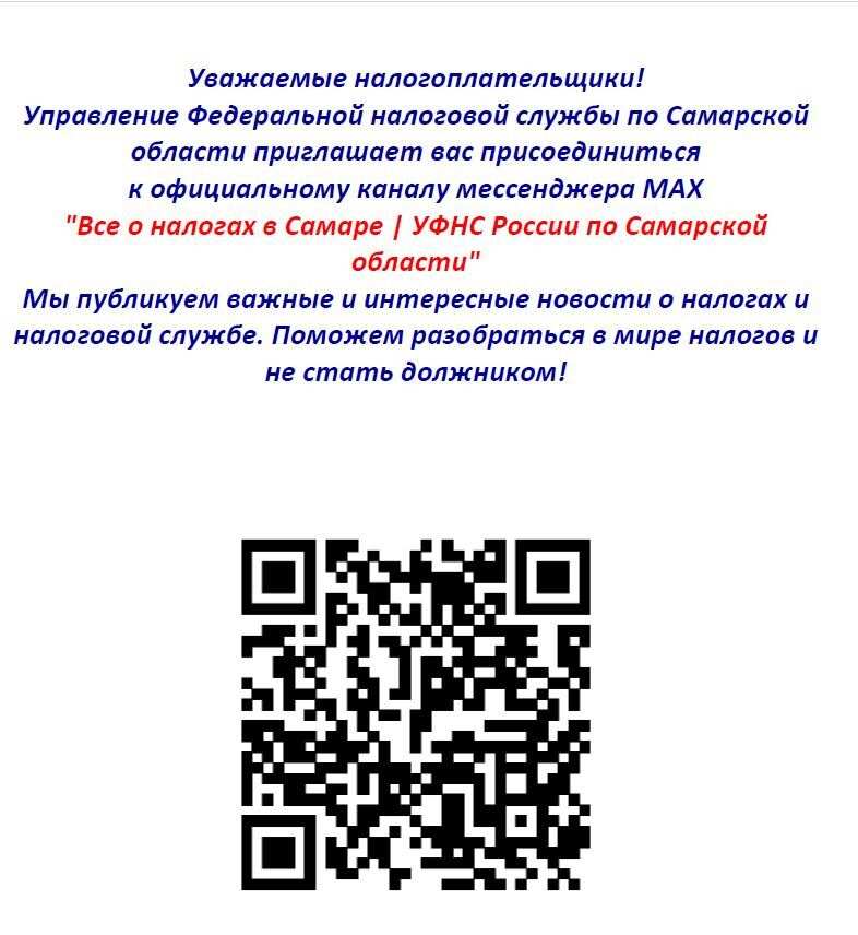 Уважаемые налогоплательщики! Управление Федеральной налоговой службы по Самарской области приглашает вас присоединиться к официальному каналу мессенджера МАХ "Все о налогах в Самаре | УФНС России по Самарской